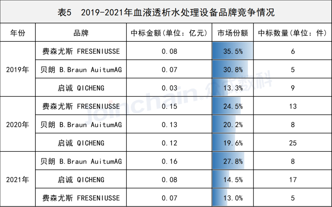 血液透析设备中,费森尤斯占领了主要市场,2019-2021年市场份额分别为46.4%、30.6%和25.7%,2021年贝朗中标金额最高,为3.53亿元,市场份额达42.4%。