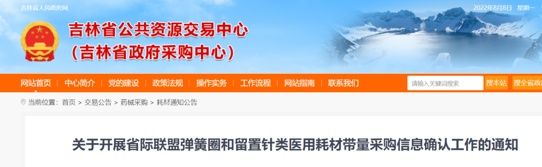 按照省际联盟医用耗材带量采购领导小组办公室的相关要求,为做好弹簧圈和留置针的带量采购工作,吉林省公共资源交易中心现组织各企业,依据国家医疗保障局弹簧圈和留置针类医保医用耗材分类与代码数据库信息,对企业及其产品进行信息确认,具体工作通知如下: