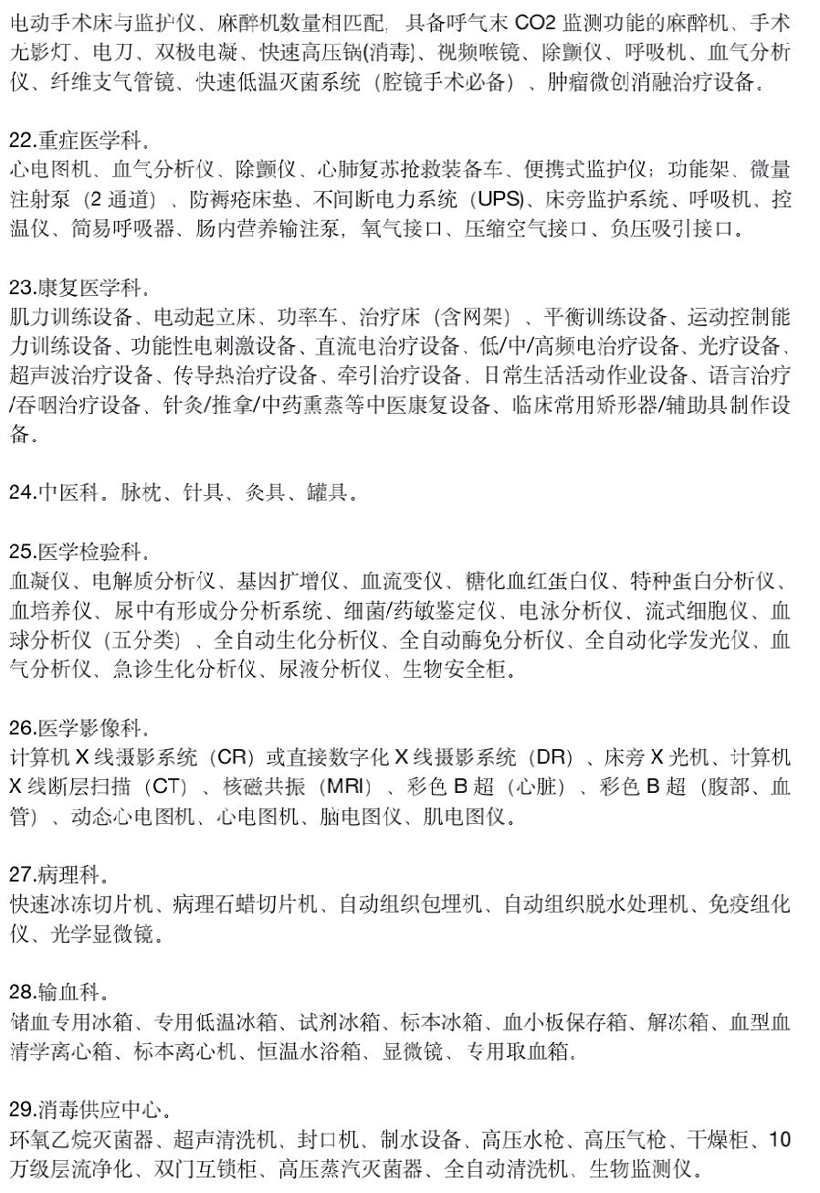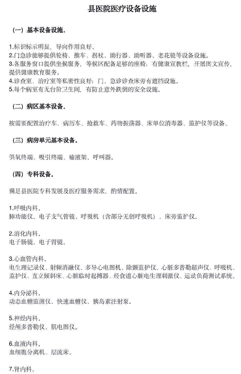 设备配置方面,《方案》还特别提到,要逐步改善硬件设施设备条件,结合专科发展需求,系统完善发热门诊、急诊医学科、住院部、医技科室等业务用房条件,加快数字健康基础设施建设,改善医疗、信息化等设备和医用车辆配置,改善停车、医用织物洗涤、医疗废物和污水处理等后勤保障设施。