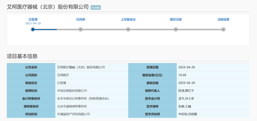 2023年4月20日,艾柯医疗器械(北京)股份有限公司(下称“艾柯医疗”)科创板IPO获上交所受理。中信证券为其保荐机构,本次拟募资10.39亿元。