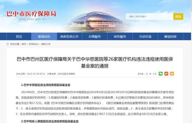 通报显示,此次最高涉案金额医院为巴州华龙医院。通报称,2023年5月,四川省医疗保障局飞行检查组对巴州华龙医院自2021年1月1日至2023年5月16日期间的医保基金结算情况开展专项检查,发现该医疗机构存在重复收费、串换项目收费、过度诊疗等情况,共涉及医疗费用249900元,其中医保基金支出191287.2元。